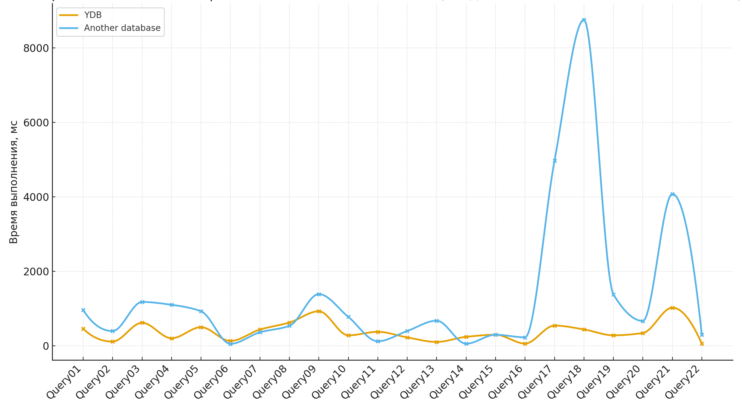 Сравнение с другой распределённой аналитической СУБД на наборе запросов TPC-H показывает, что YDB демонстрирует более стабильную производительность, особенно при выполнении запросов, содержащих: